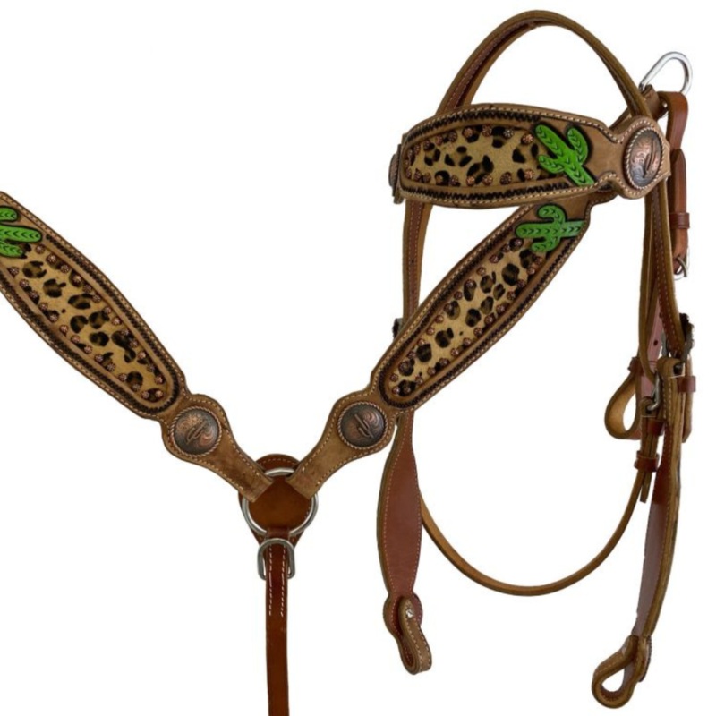 This set features a light colored leather with hand painted cactus' on the breast collar and headstall with hair on cheetah. This set is accented with copper beads and large copper cactus conchos. Set comes complete with 5/8" x 7' split leather reins.CLEAR