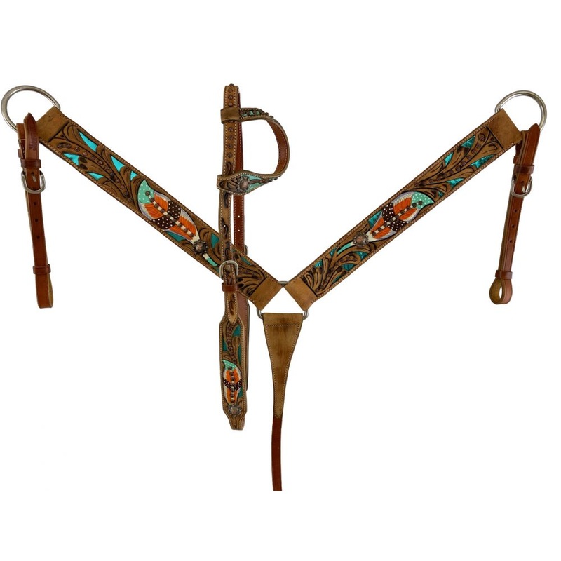 Showman Hand Painted Feather Design One Ear Headstall and Breast collar Set. This set features a medium colored leather with hand painted feather design throughout with a floral tooling. The Breastcollar has a metallic teal inlay to set off the painted des