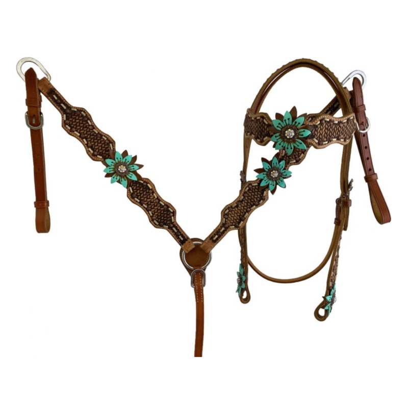 Showman Hand Painted Leather 3D Teal/Brown Flowers on Brow band Headstall and Breast collar Set.