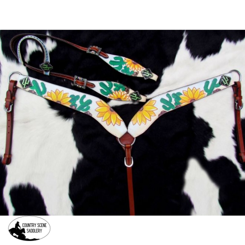 14251This set features medium leather with hand painted sunflower and cactus overlay accented with lime green crystal rhinestone cactus rhinestones. Set includes one ear headstall, matching breastcollar, and 5/8" x 7ft leather split reins.Matching wither s