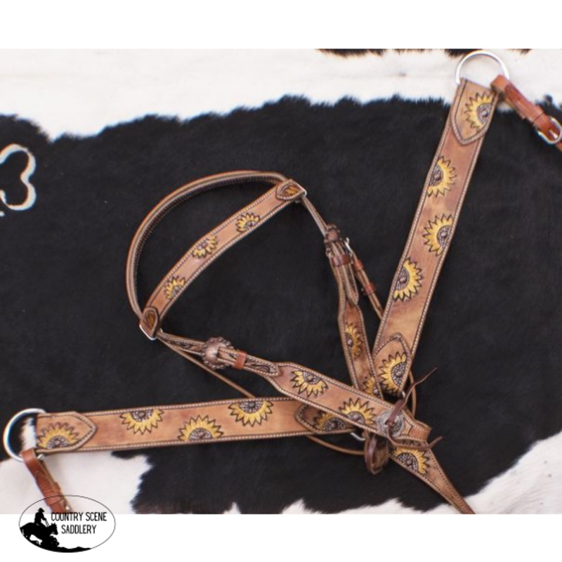7062Showman Hand Painted Sunflower Browband Headstall and Breast collar Set. This set features a medium colored leather with hand painted sunflower halves throughout the headstall and breast collar. Set is accented with copper conchos, copper floral studs,