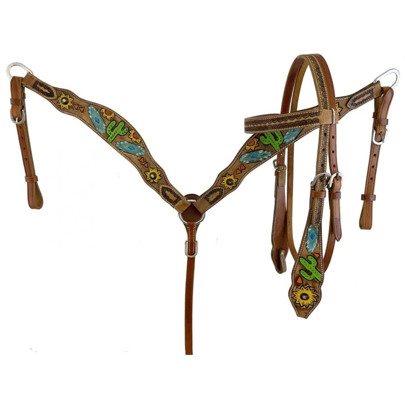 Showman Hand painted sunflower, southwest and cactus headstall and breast collar set. This Medium oil set features hand painted sunflowers, cactus and southwest designs on the breast collar and Browband headstall, features a micro flower accents, 7ft reins included.FINAL CLEARANCEThis is a CloseoutDiscontinued item. Sizes, colors and quantities are limited.No refundsNo exchanges on CloseoutDiscontinued items. Products are sold as is.var TabbedPanels1=new Spry.Widget.TabbedPanels(TabbedPanels1);