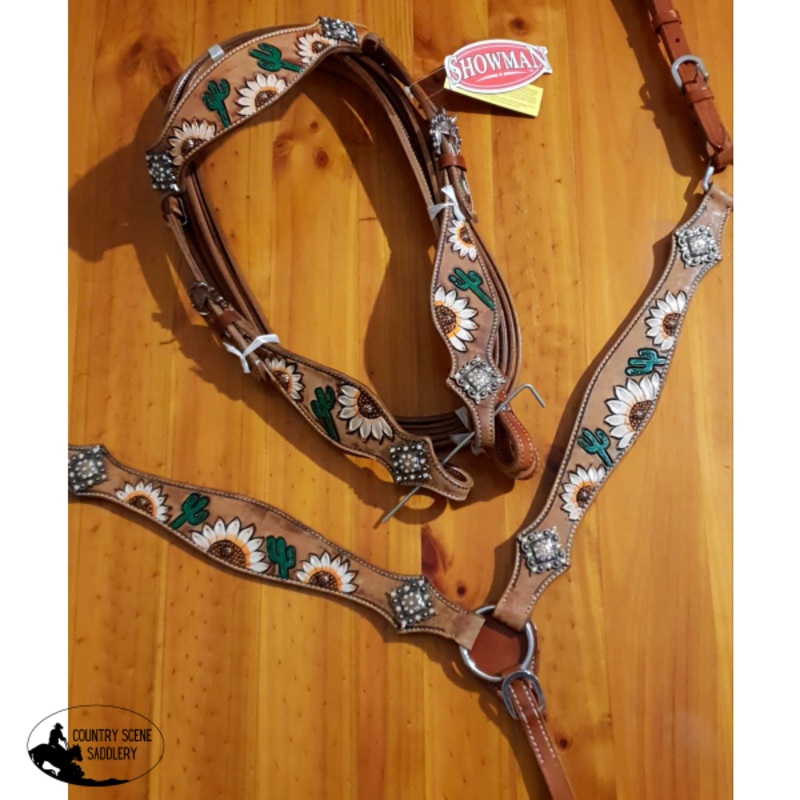 7055Showman Hand Painted White Sunflower and Cactus Browband Headstall and Breastcollar Set. This set is medium brown in color with a browband headstall. Set is accented with hand painted white sunflowers and cactus' with copper iridescent conchos. Set com