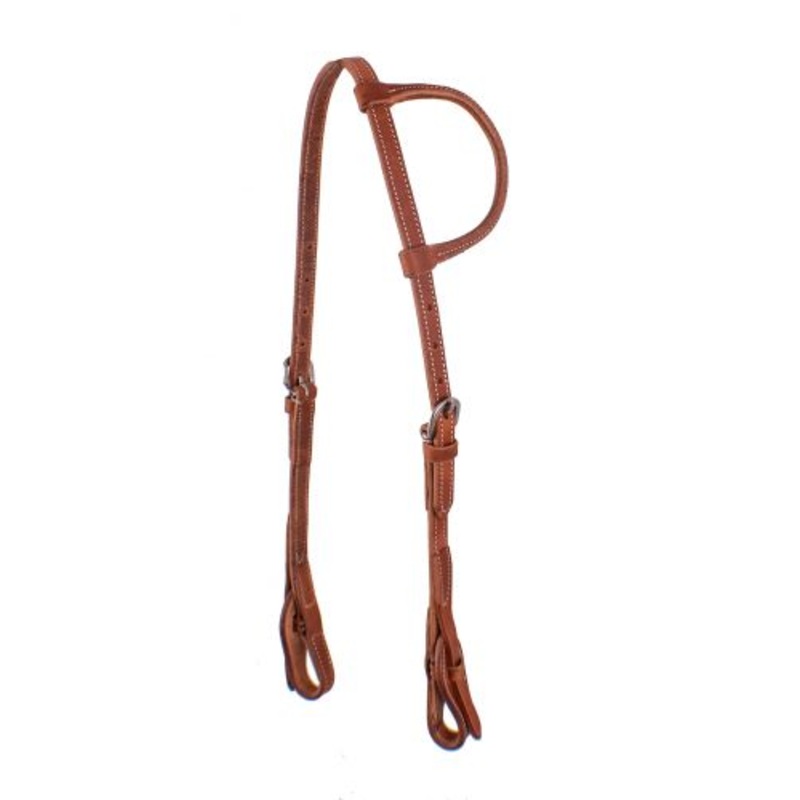 Showman Harness Leather one ear headstall with quick change bit loops. This headstall features harness leather with stainless steel hardware and quick change bit loops.Hardware is Stainless Steel.var TabbedPanels1=new Spry.Widget.TabbedPanels(TabbedPanels1