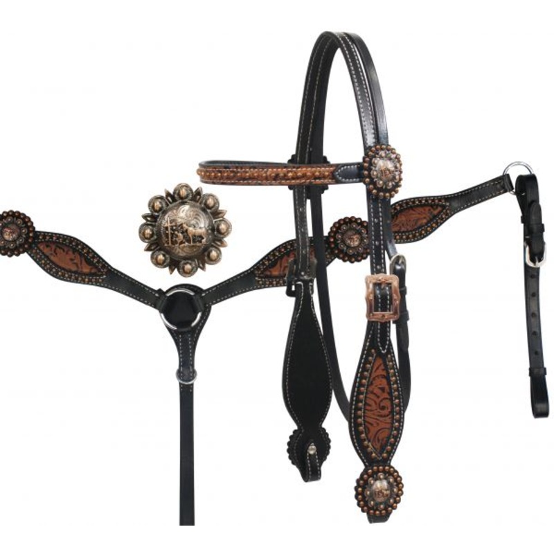 SF12762ShowmanHeadstall and Breast Collar Set with Brown Filigree Inlay and Praying Cowboy Conchos. This headstall features brown filigree print overlay on browband andbrown filigree inlay on oval cheeks accented with copper colored studs. Bit loops and br