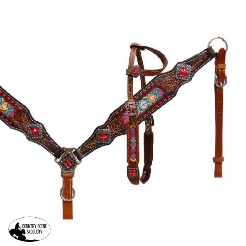 ShowmanHeadstall and breast collar with beaded inlay. This set features medium oil leather accented with chocolate tooled leather on cheeks and breast collar. Tooled leather is accented with pink buck stitch design, pink crystal rhinestone conchos and a multi color beaded inlay. Headstall comes with 5/8″ x 7′ leather split reins.