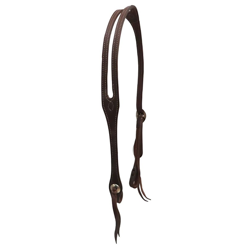 Heavy oiled harness leather split ear headstall with stitched edge.