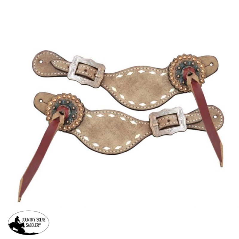 30934Showman Ladies Roughout Leather spur straps with natural buckstitch trim. Spur straps are accented with conchos with leather tassels, copper studs on rosets, and copper engraved buckles.Matching Halter #16683Matching HS/BC Set #14291Matching Flag Hold