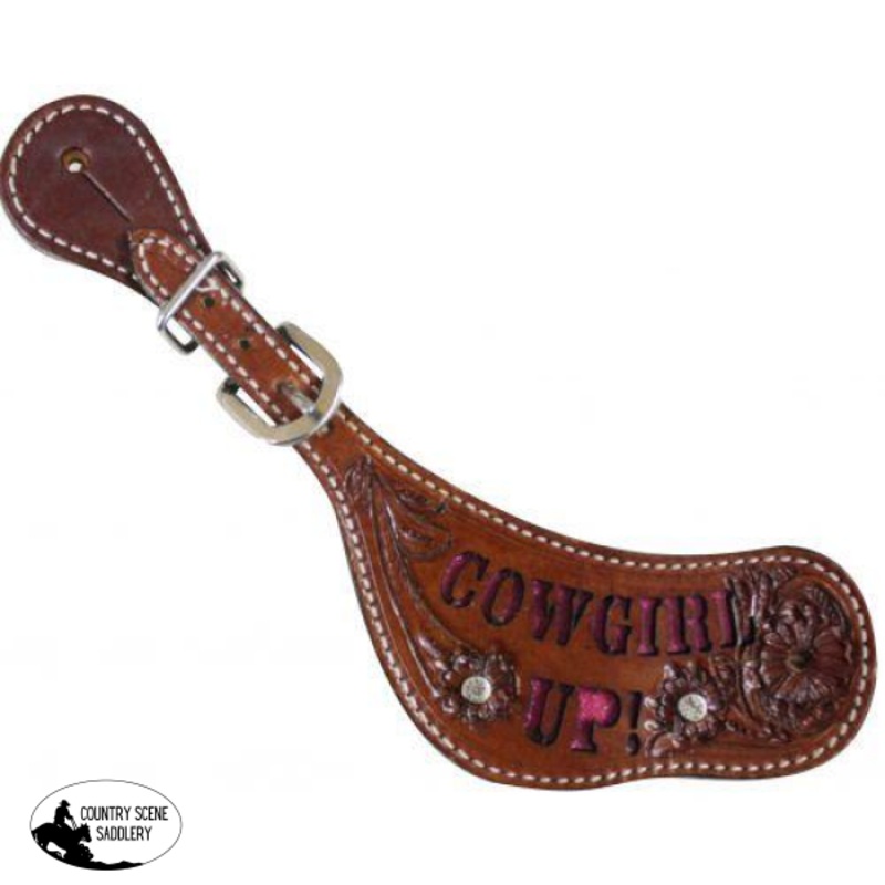 30628ShowmanLadies " Cowgirl Up" Spur Straps with Glitter Inlay. These straps feature floral tooling and cut out " Cowgirl Up" with pink glitter inlay. Straps are accented with crystal rhinestones. Adjusts 8" to 9". MadeShowmanby products.