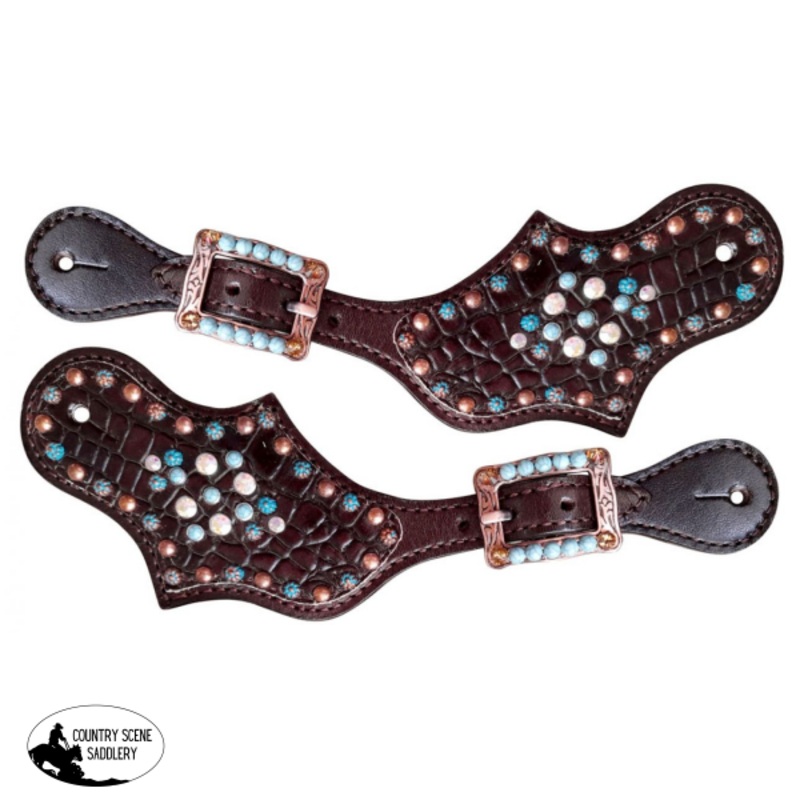 30967ShowmanLadies Gator spur straps with copper and turquoise beading. These spur straps feature dark oil leather with gator overlay design. Accented with copper and turquoise dots, engraved vintage copper hardware.Matches: 14416, 177667, 16761PRE ORDERS