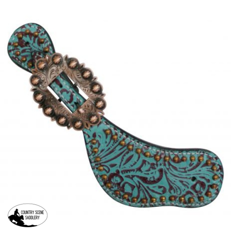 175499Showman Ladies Size Leather Spur Straps with Filigree Print. These straps feature teal leather with brown filigree accented with copper colored studs. Large copper colored engraved buckle. Adjusts 7.5" to 9". Made byShowmanproducts. Please note print