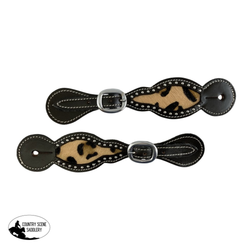 202630Showman Ladies spur straps with hair on cheetah inlay.These spur straps feature dark oil leather with hair on cheetah inlay. Accented with silver dots and bucklesPRE ORDER USA