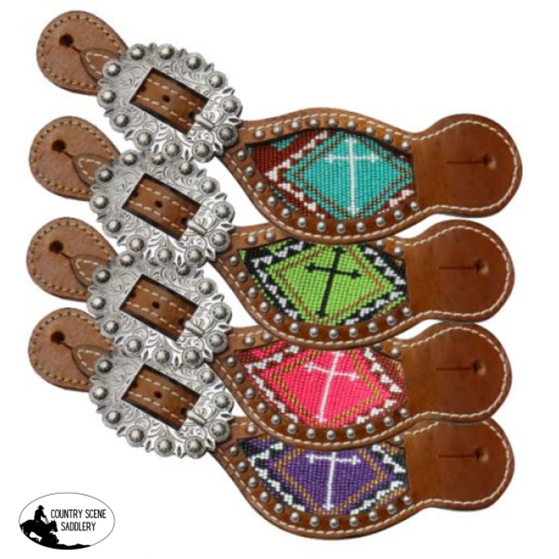 ShowmanLadies Teal and brown beaded cross spur straps. These spur straps feature medium silver studded leather with a brown, teal and white cross design beaded inlay and a large engraved buckle.Adjust 8"-9.5".Headstall set #13076Rope halters #16173,#16308B