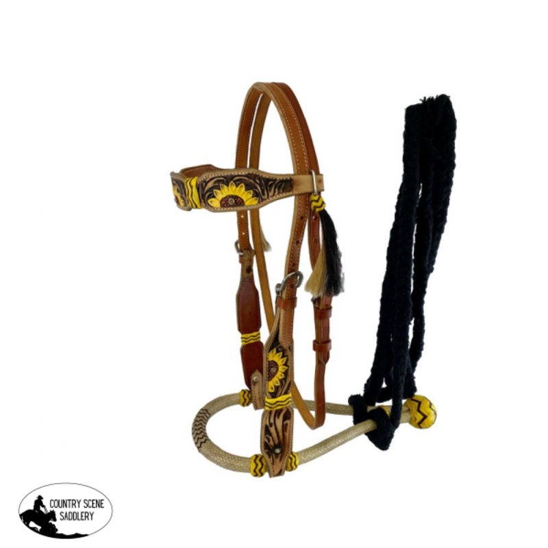 7030ShowmanLeather bosal headstall withsunflower painteddesign on medium leather and black cotton mecate reins. This bosal headstall features a sunflower painted design in brown and yellow colors, offset by yellow & brown rawhide braiding.Constructed with