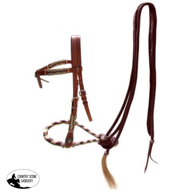 Showmanleather futurity knot headstall with brown rawhide braided bosal and brown nylon mecate reins. This headstall features double stitched medium oil leather with a futurity knot headstall. Headstall is accented with brown and natural rawhide braiding. Bosal features brown and natural braided rawhide and comes with brown nylon mecate reins with horse hair tassePre Order USA