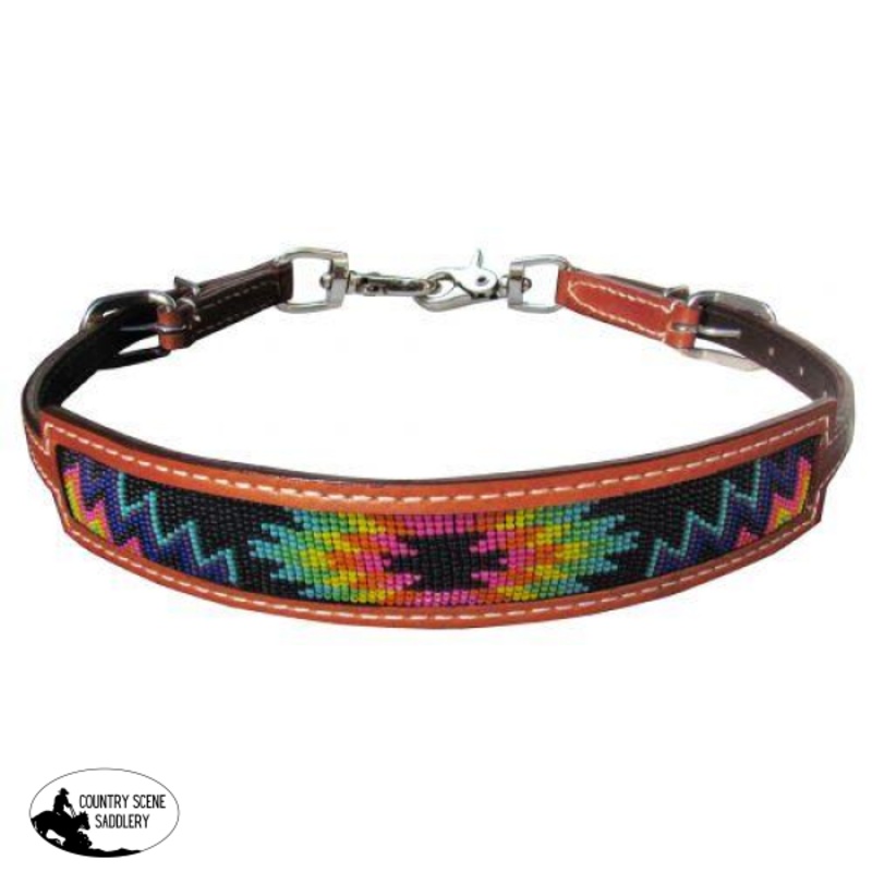 ShowmanMedium leather wither strap with rainbow navajo design inlay.This wither strap features a navajo beaded inlay design on medium oil leather. Beads are pink, teal, orange, yellow, lime, purple, and black in color.Easily attach to breast collar with double scissor snap ends. Adjusts 23″ – 29″.