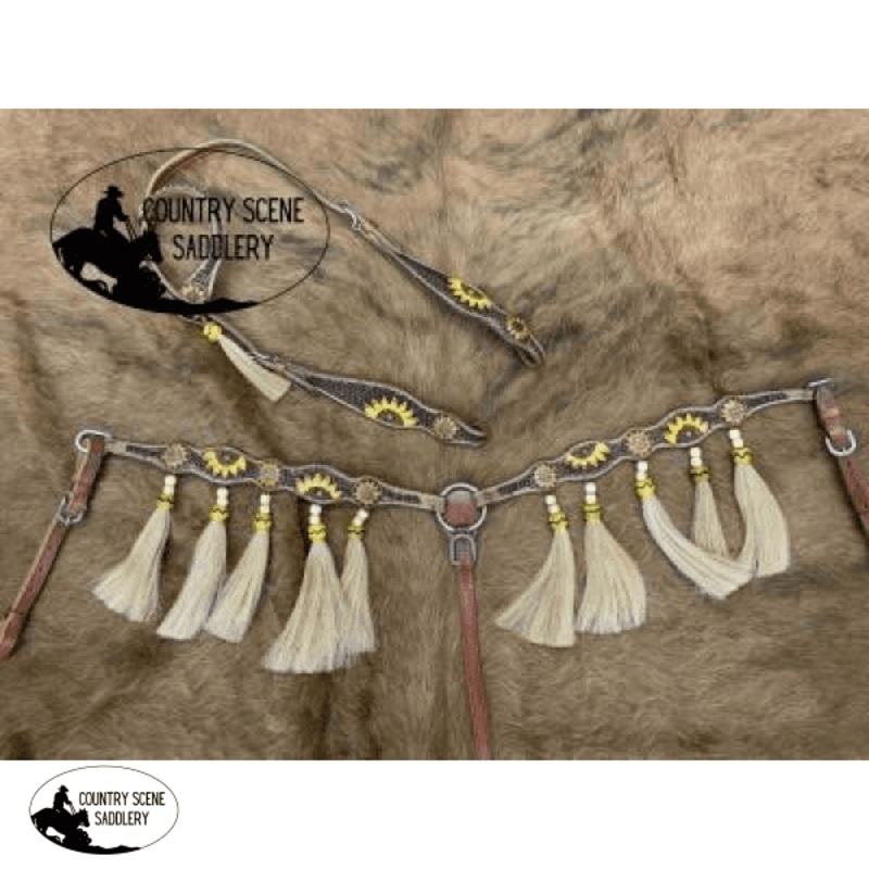 8031ShowmanMedium Oil Browband Headstall and Breast collar set with Painted Sunflower Design and Horse Hair Tassels. These set features a beautiful painted half moon sunflower design on medium leather and accented with Horse Hair tassels accented with rawh