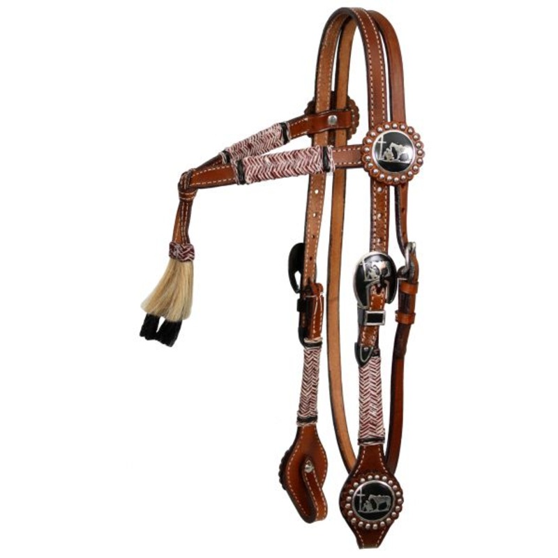 Showman Medium Oil Double stitched leather futurity knot rawhide braided headstall with praying cowboy conchos. Headstall features rawhide braiding on futurity knot and cheeks. Headstall is accented with praying cowboy conchos. Headstall comes with 58 X 7′ leather split reins. Made byShowman products.var TabbedPanels1=new Spry.Widget.TabbedPanels(TabbedPanels1);