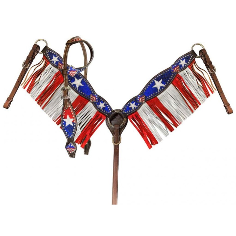 This Medium Oil Patriotic Set Features a Blue Snakeskin overlay with a white Star design. This set has silver beading, red/white/blue conchos and red & white fringe. Headstall comes with5/8" x 7' split reins.
