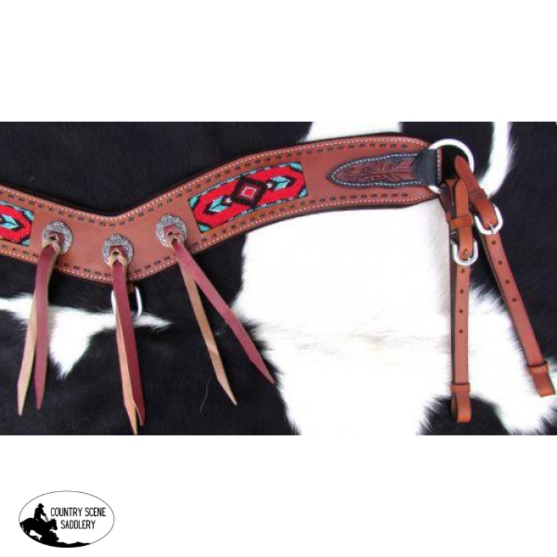 14004ShowmanNavajoBeaded Inlay tripping collar.This tripping collar features medium smooth leather with a red and teal navajo print beaded inlay and dark leather buckstitch trim. Accented with 3 engraved conchos in center with leather tassels. Measures 4"