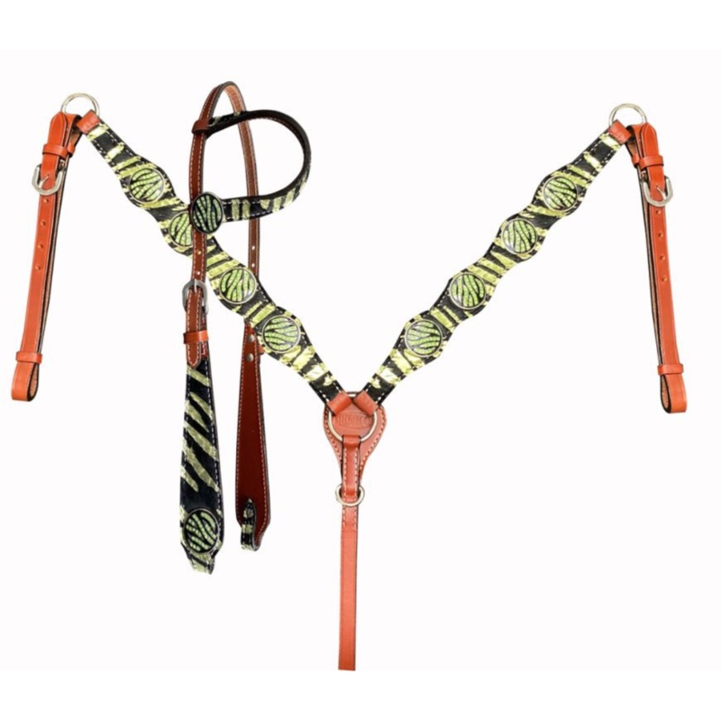 Neon Zebra Print One Ear Headstall and Breast Collar set.Set includes one ear headstall and breast collar.*No Reins*CLEARANCEThis is a Closeout/Discontinued item. Sizes, colors and quantities are limited.No refunds/No exchanges on Closeout/Discontinued ite