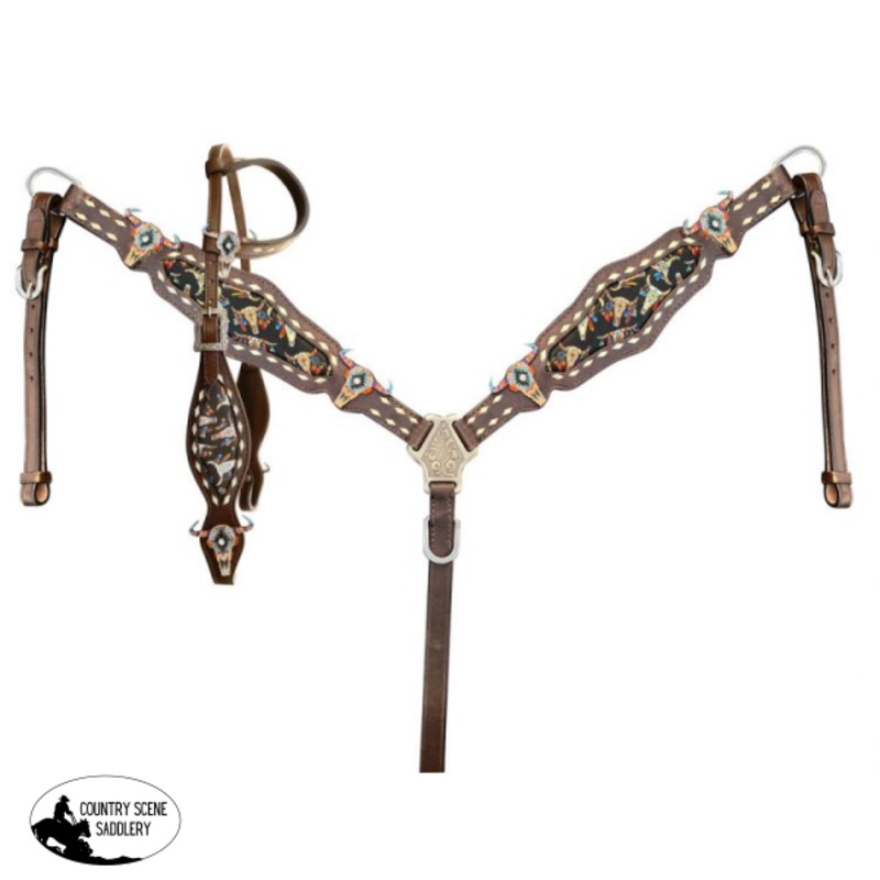 Showman Painted southwest design cowskull leather One Ear Headstall and Breastcollar Set. This set features a cow skull accent with white buckstitch trim.