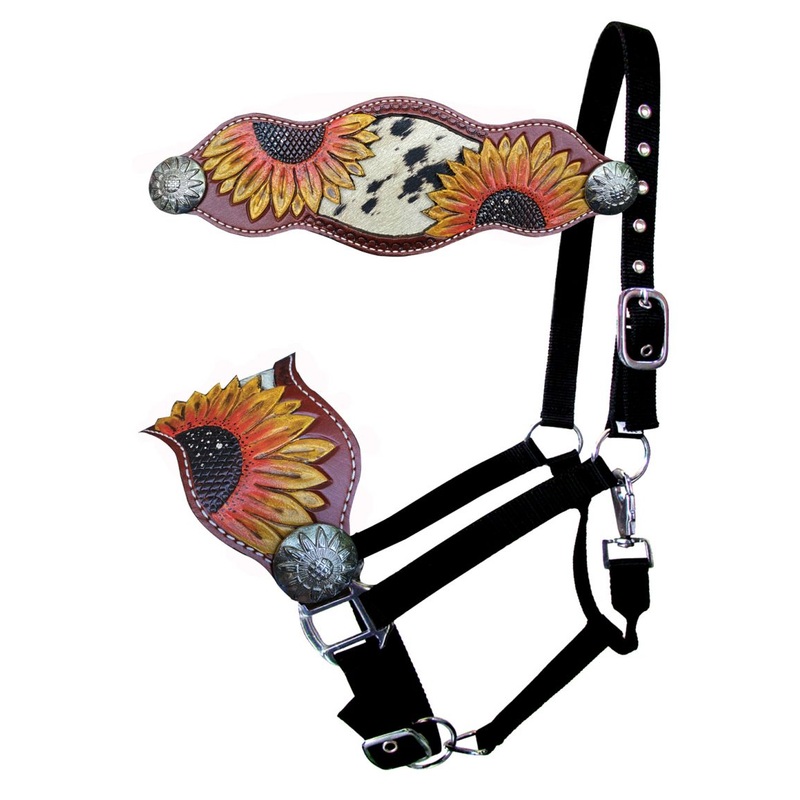 Showman Painted Sunflower Nylon bronc halter with cowhide inlay.This is a black nylon halter with dark oil leather and cowhide inlay nose band. Accented with crystal rhinestone Conchos to match.AVERAGE HORSE SIZE 800-1100LBS var TabbedPanels1=new Spry.Widget.TabbedPanels(TabbedPanels1);