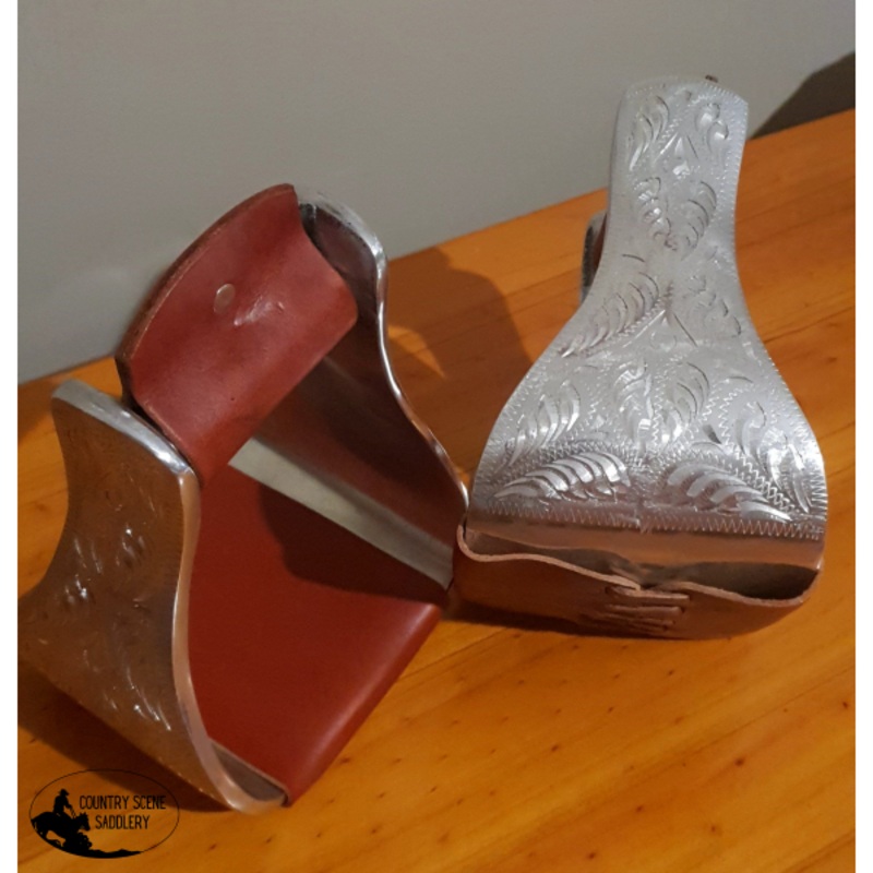 ShowmanPolished Aluminum Engraved Bell Stirrups. Feattures medium colored leather tread.