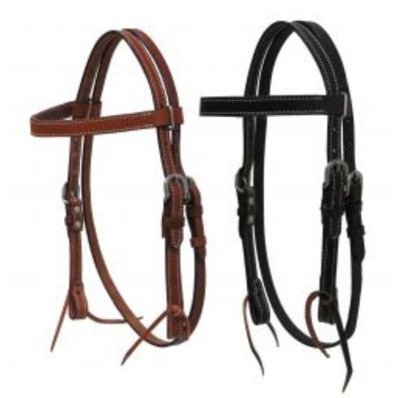 This headstall features double stitched leather with stainless steel hardware and tie on bit loops.