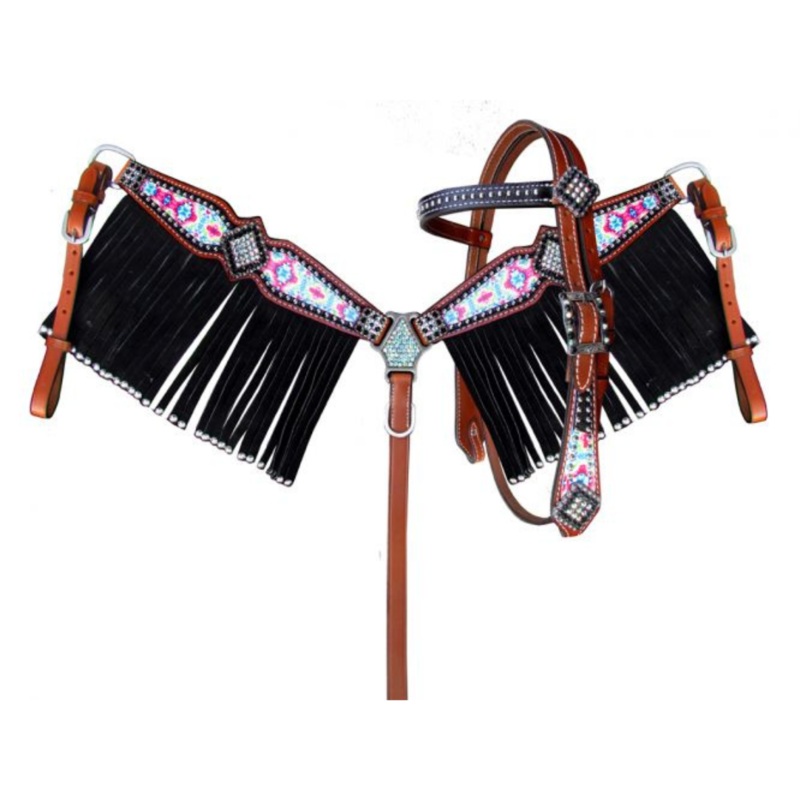 This set features medium oil leather with a pyschedelic tie dye print overlay trimmed in a black leather overlay. The set is accented with black and iridescentcrystal rhinestone conchos and silver studs. Breastcollar features black suede leather fringe wit