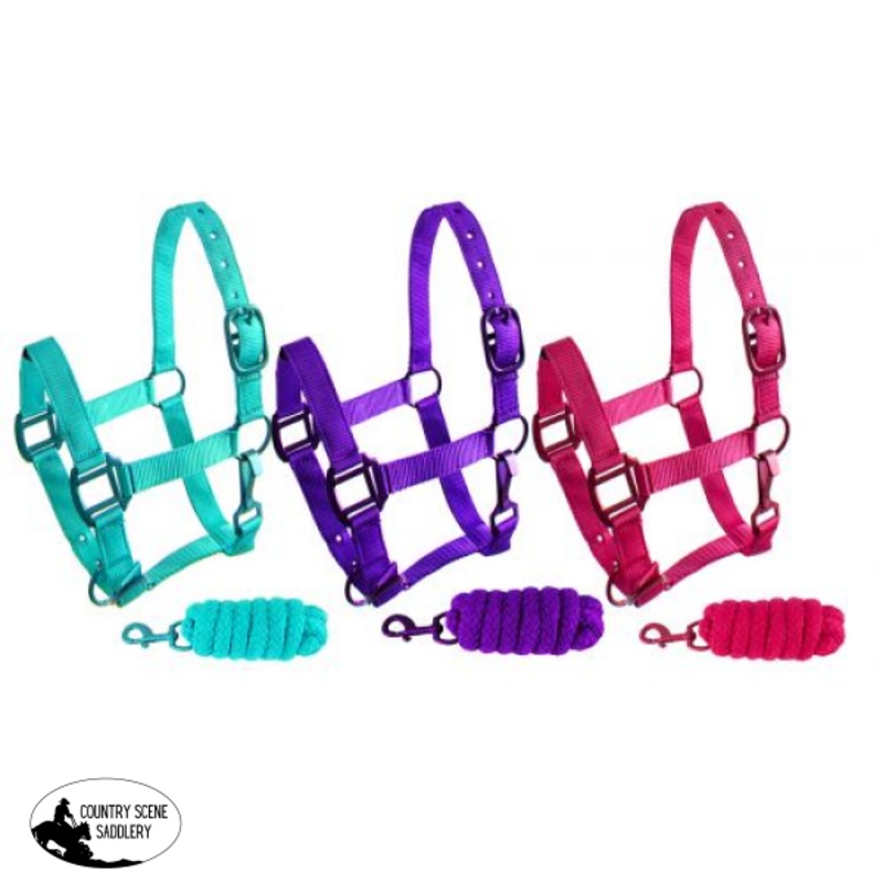 Showman Ponytriple ply nylon halter and lead rope with matching powder coated hardware. Halter is constructed of triple ply nylon with matching powder coating hardware. Halter has an adjustable nose and a hook throat latch. Lead rope measures 8′.