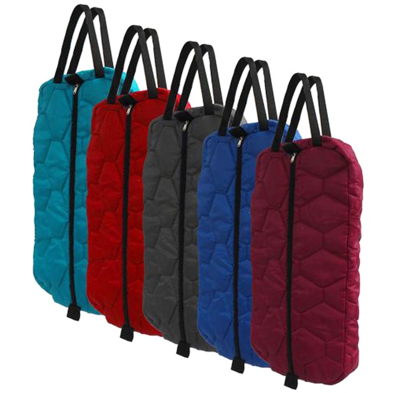 Showman Quilted nylon bridle bag with zipper front. Keep all of your halters and bridles clean and handy with this durable quilted nylon bag. Heavy duty full length zipper with inner hanging straps with buckle and two nylon carrying straps. Measures 26 H x