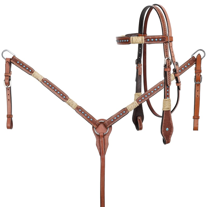 Add a touch of Southwestern charm to your ride with the Showman Rawhide Braided Headstall and Breastcollar Set with Turquoise Studs!Crafted from medium oiled leather with detailed basketweave tooling, this set brings classic Western craftsmanship to the forefront. The natural braided rawhide accents add authentic texture and rugged style, while vibrant turquoise studs deliver a pop of color thats both eye-catching and timeless.Designed for riders who appreciate traditional flair with a modern twist, this set combines durability with standout looks. Adjustable cheeks, throatlatch, tugs, and center strap ensure a perfect, comfortable fit for your horse. Plus, the included 58 x 7′ leather split reins provide excellent control for every ride.Whether youre hitting the trail or showcasing at the arena, the Showman Rawhide Braided Set is your go-to for Southwestern-inspired style and unbeatable quality.Medium Oiled Leather with Basketweave Tooling classic Western texture and durability.Natural Braided Rawhide Accents authentic, rugged detail that stands out.Turquoise Studs vibrant color highlights that bring Southwestern flair.Adjustable Cheeks, Throatlatch, Tugs, and Center Strap customized comfort and fit.Includes 58 x 7′ Leather Split Reins durable and reliable for precise control.Perfect for Trail Rides, Shows, or Everyday Use style and function in one complete set.var TabbedPanels1=new Spry.Widget.TabbedPanels(TabbedPanels1);
