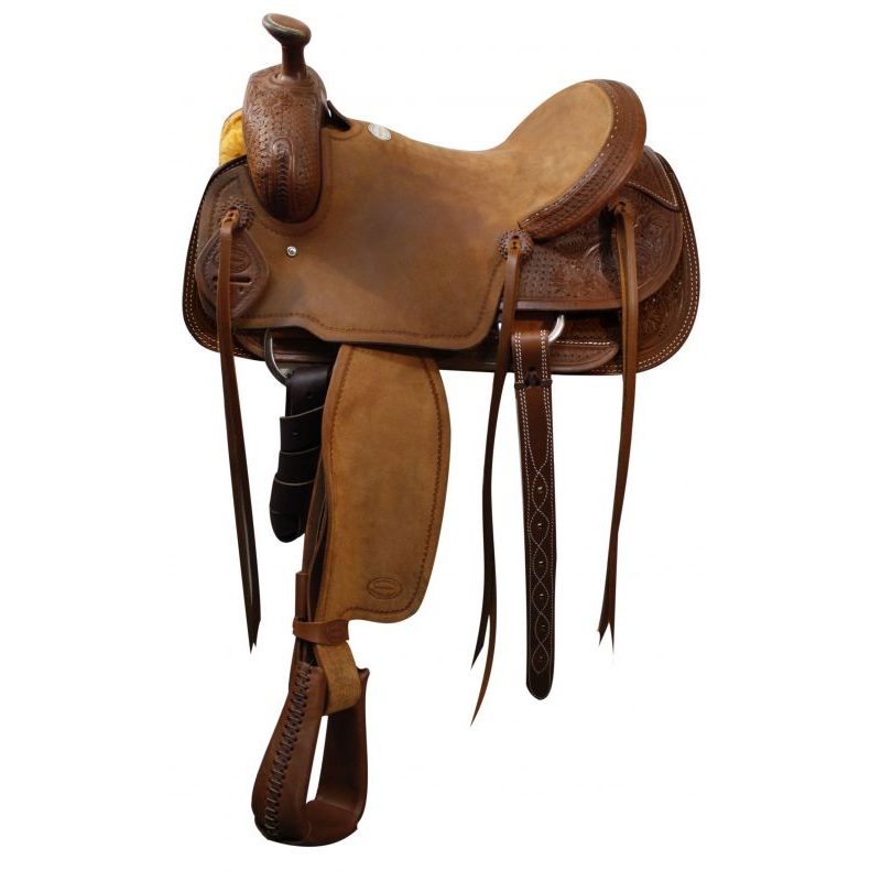 Showman roper style saddle. This saddle features braided basket weave tooling with floral tooled accents on skirts, pommel and cantle. Rough out fenders and jockeys are accented with a tooled border.