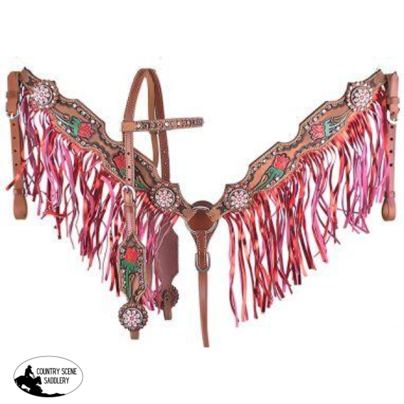 7082XShowman Rose painted brow band headstall and fringe breast collar set. This set features hand painted Rose accents with red and clear stone studs and crystal/flower rosette rhinestone Conchos. Breast collar is accented with red metallic fringe and cry