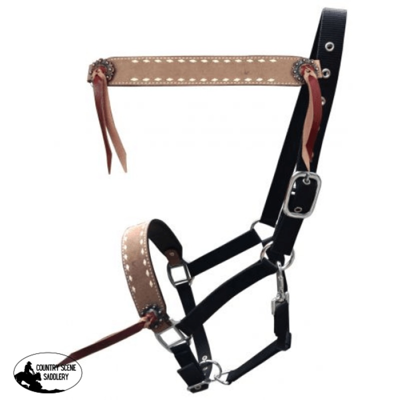 Showman Roughout leather nylon halter with buckstitch trim. This halter features a leather noseband and natural buckstitch trim. Durable black webbed nylon with nickel plated hardware and eyelests makes this halter adjustable on crown and noseband. Halter is accented with copper conchos with leather tassels.
