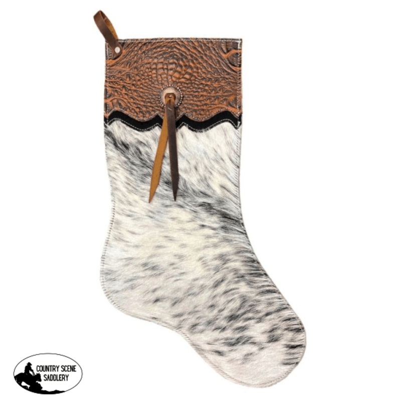 178480Showman Salt and Pepper Cowhide Christmas Stocking - Alligator CuffThis stocking is the perfect addition to your western-themed Christmas decor! This unique stocking features a salt and pepper hair on cowhide front body and a uniquely shaped alligato