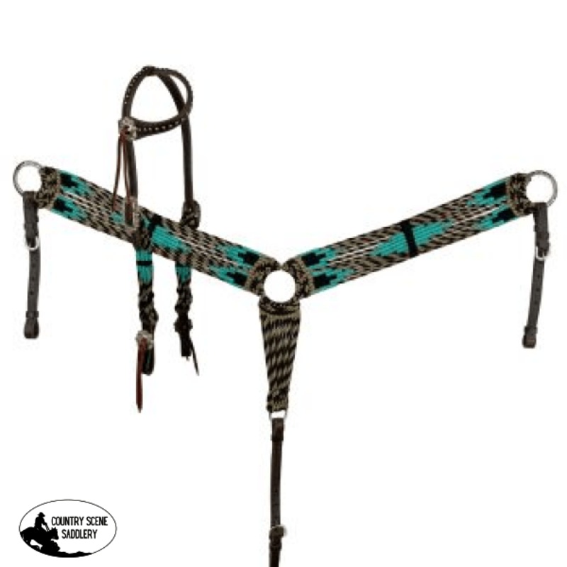 The breast collar stands out with its vibrant teal, pink, grey, and black woven corded design, creating a striking visual appeal that is both modern and stylish. It is equipped with adjustable tugs and a center strap with a snap, allowing for easy adjustments and a custom fit. This set is not only about looks but also functionality, providing reliable support during rides.