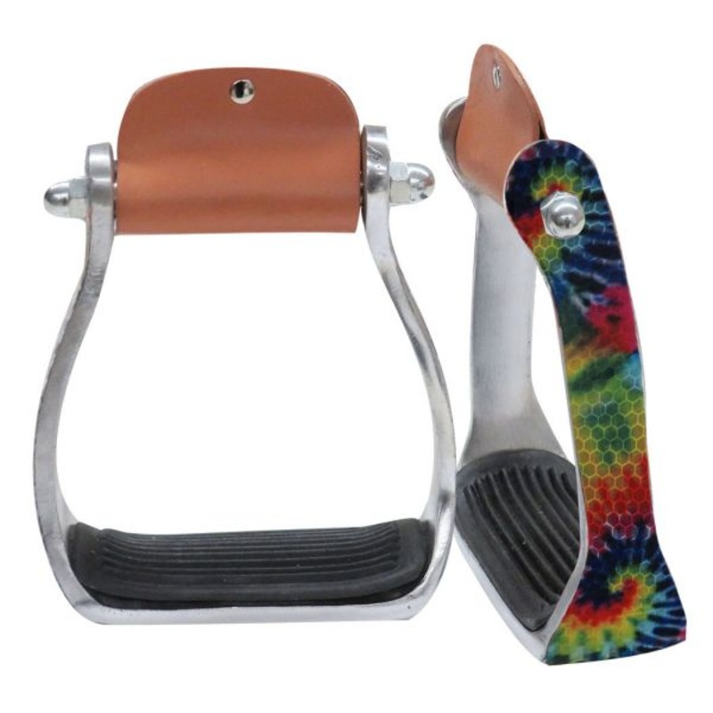 Showman Shimmering tie dye print stirrup.This stirrup featuers lightweight aluminum with a rubber grip tread bottom.Lightweight aluminum2 tread3 neck4.75 width*Print may vary from shownCLEARANCEThis is a CloseoutDiscontinued item. Sizes, colors and quantit