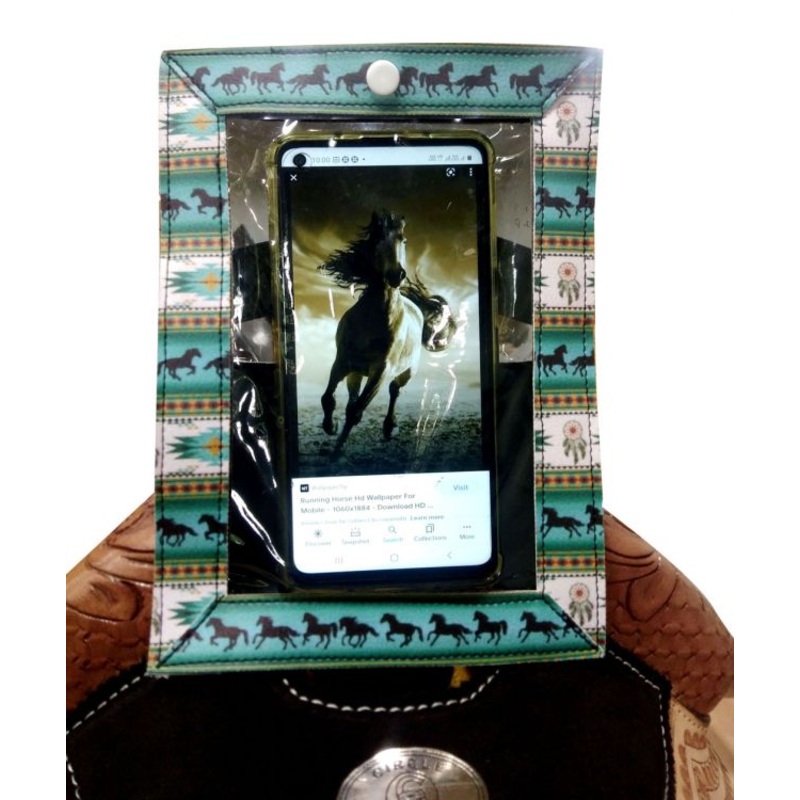 Showman Smart Phone Southwest Design Print Case for Saddle. Slip your phone into this case which features straps to easily attach to your saddle horn for long trail rides, has clear front to easily access your phones features, back side features clear top