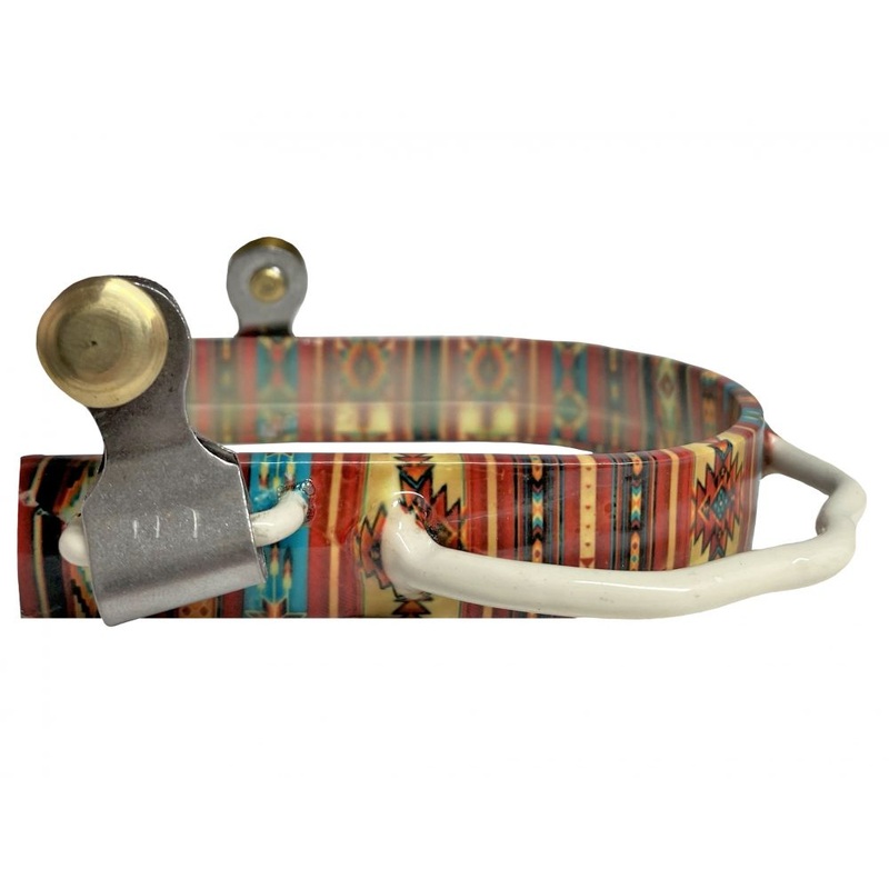 Showman Southwest Stainless Steel Bumper Spur. Spurs feature light weight stainless steel with a stainless-steel bumper. This spur has a 34 band and 3 boot opening. Spurs have a Southwest overlay print. Made by Showman Products. Sold in pairs.NOTE: Pattern