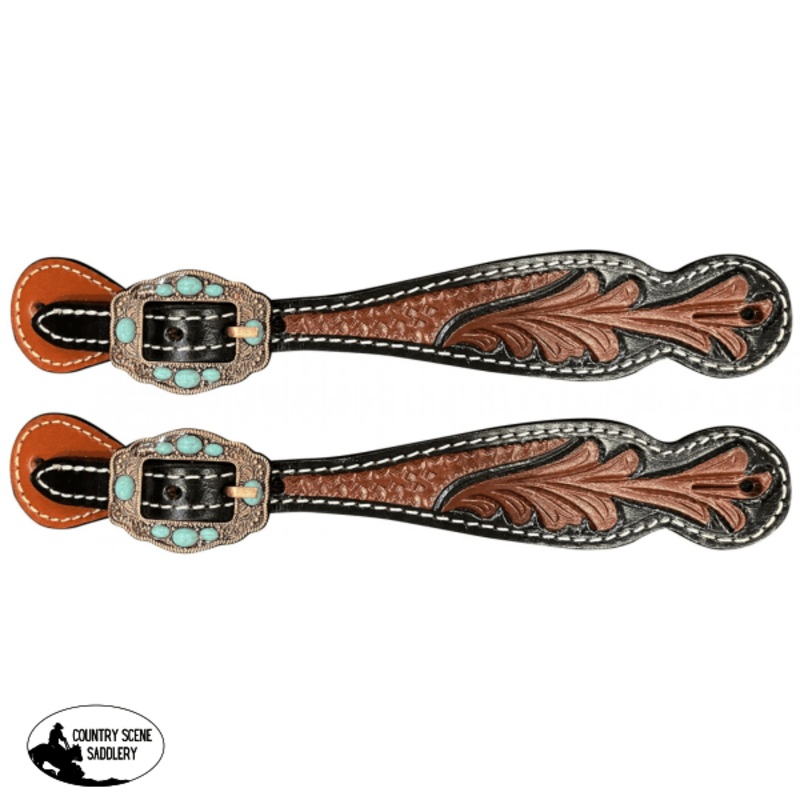 ShowmanLadiestwo toned floral tooled spur straps.These straps feature dark brown leather with a medium floral tooled design. They are accented with a silver buckle with turquoise accents.