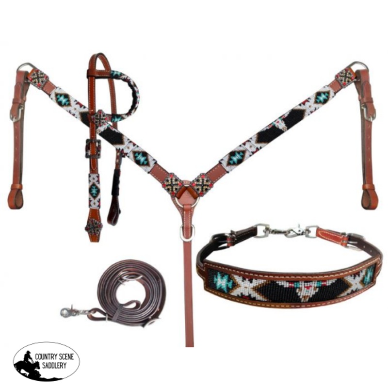 14378Showman SW beaded One Ear headstall and breastcollar set. This set features a medium brown leather with southwest beaded design. The white, black and teal beading is accented with square copper bling conchos and buckles.Set comes complete with 5/8" x