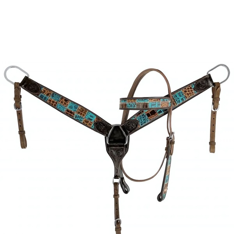 This set features a dark leather with white stitching accents. Set comes complete with matching headstall, breast collar, and 5/8" x 7' leather split reins.Matches# SS-37, WS-52, 722793, 15869