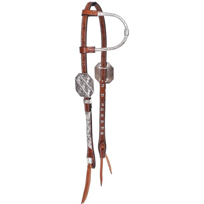 This headstall features medium oil Argentina cow leather with single ear. Headstall has engraved silver plates on cheeks and single ear and is accented with fully engraved octagon shaped silver buckles.