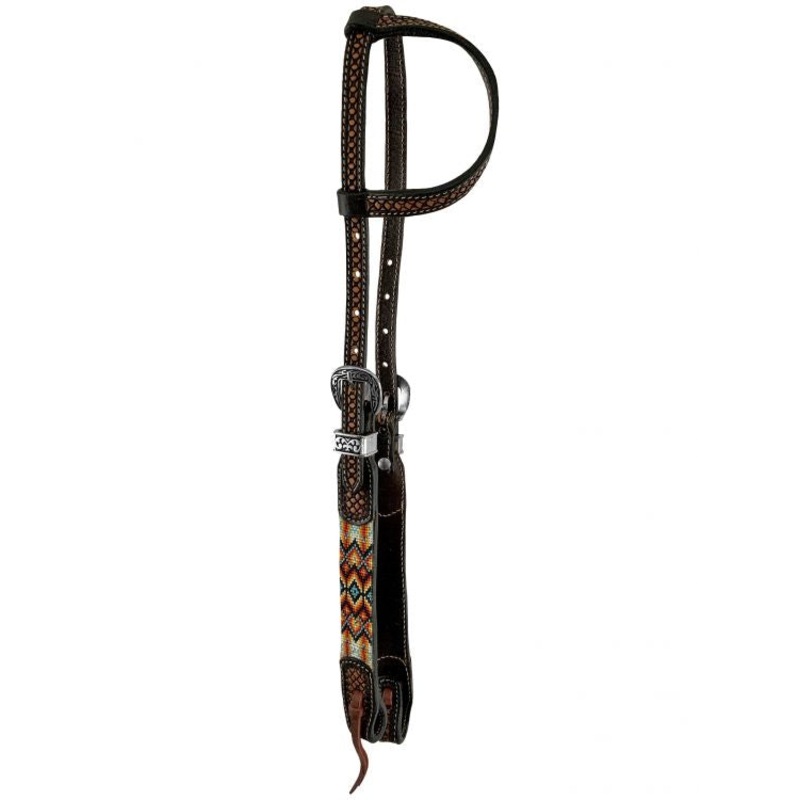 Crafted from two tone Argentina cow leather, this single ear headstall features medium and dark leather with teal, red, yellow, white, and black beading inlay on cheeks. Accented with pebble stamp detail on cheeks and ear, and white stitched edges. Adjustable at both cheeks with antiqued silver buckles with black inlay. Complete with tie bit ends.NOTE: Reins not included.Horse size.var TabbedPanels1=new Spry.Widget.TabbedPanels(TabbedPanels1);