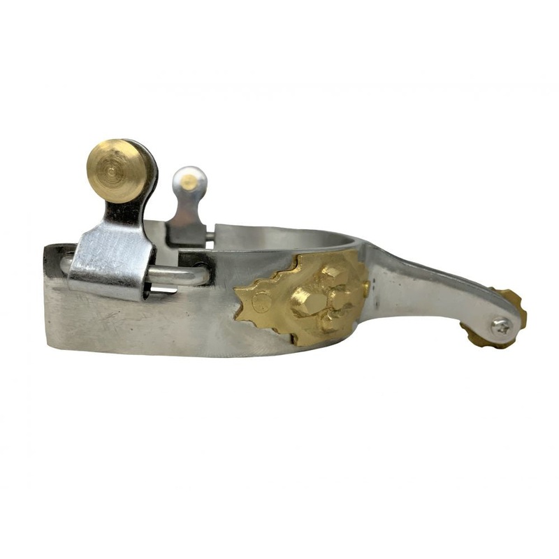 Showman Western Stainless Steel Mens size spurs with brass decorations. These spurs feature a brass plated rowel and buttons.Shank: 1.75 Band Width: 1 Boot Width: 3 12CLEARANCEThis is a CloseoutDiscontinued item. Sizes, colors and quantities are limited.No