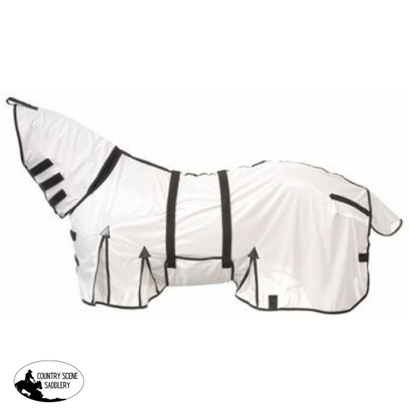 75282Showman White Lightweight Mesh Fly Sheet with Neck Cover.Lightweight poly/mesh allows natural air circulation over the horse while keeping annoying flies and insects away. Contour fit with double buckle front, belly wrap with "quick grip" closure, adj
