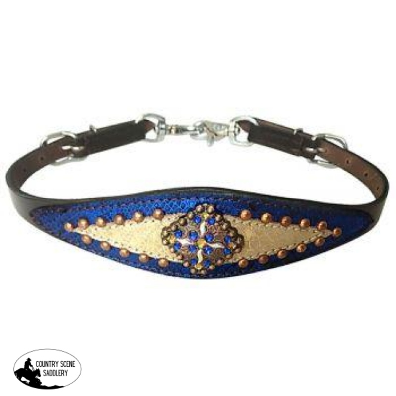 Showman Gold Metallic and royal blue wither strap with concho and copper beading. This wither strap features dark oil leather with gold metallic and royal blue design inlay with copper beading and matching Conchos. Easily adjusts with 2 buckles 23″-30″