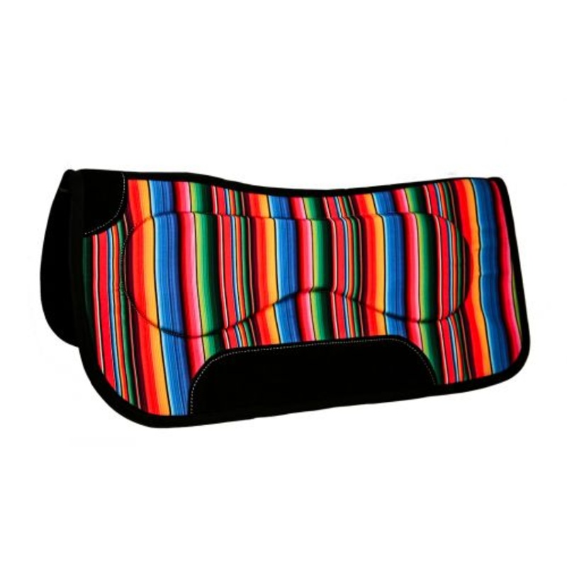 SF4974Showman 31" x 32" x 18mm wool/felt saddle pad with multi-color serape pattern. Features a build up and contoured back design with contrast stitch seams and black wear leathers.